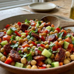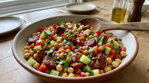 Ensalada de garbanzos con chorizo Ingredientes: (para 4 porciones) 400 g de garbanzos cocidos (puedes usar garbanzos enlatados o cocidos en casa) 200 g de chorizo (puede ser chorizo fresco o curado, según prefieras) 1 pimiento rojo, picado 1 pepino, pelado y picado 1 cebolla roja, picada finamente 2 tomates medianos, picados Aceite de oliva…