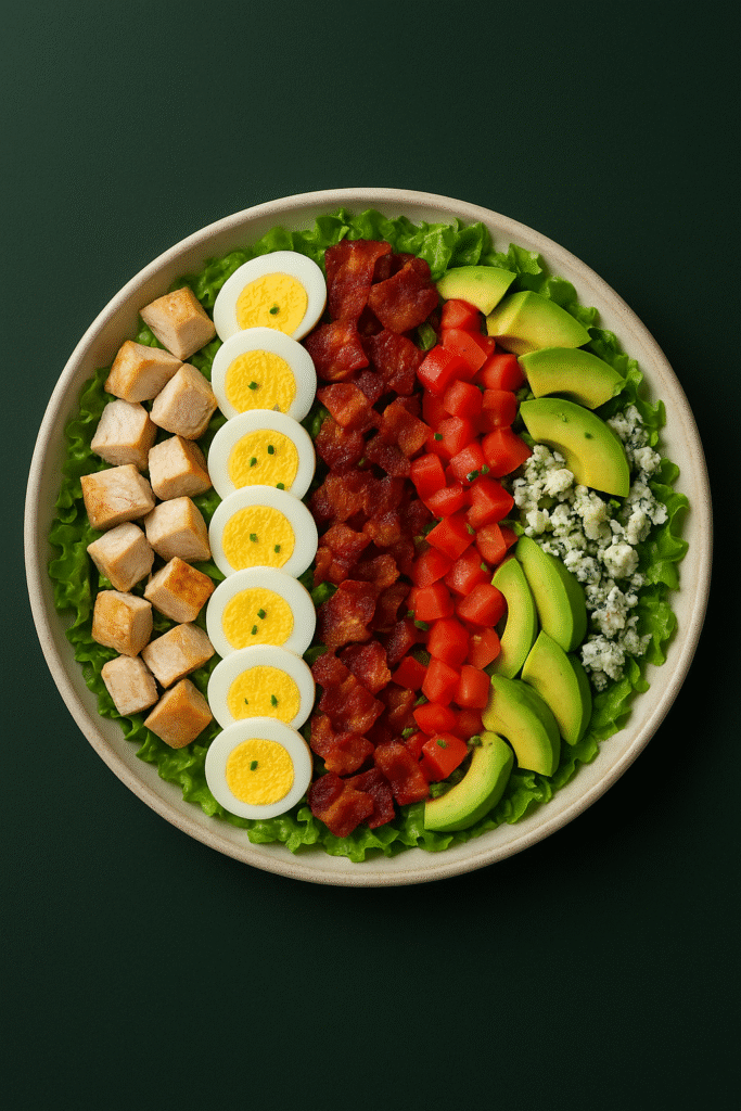 Encima, distribuye en filas (para un efecto visual atractivo) el pollo, el huevo, el tocino, el tomate, el aguacate y el queso azul. - Prepara el aderezo: