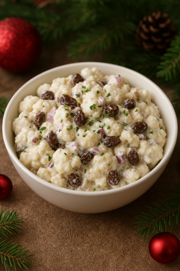 - En un bol grande, mezcla la coliflor fría con la cebolla morada, las pasas y las nueces (si las usas).