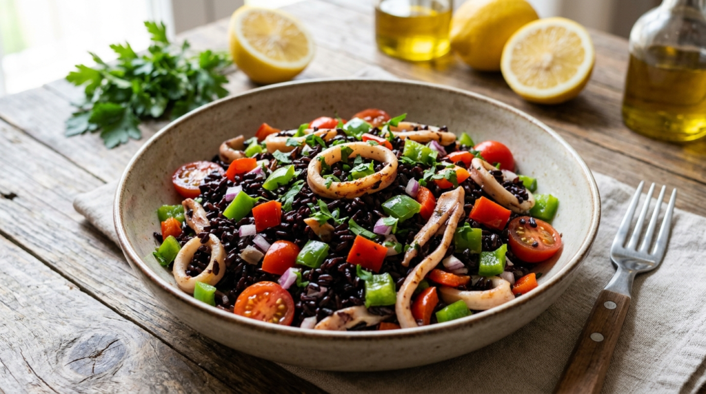 En un tazón grande, mezcla el arroz ya frío con los calamares, las verduras y el perejil.