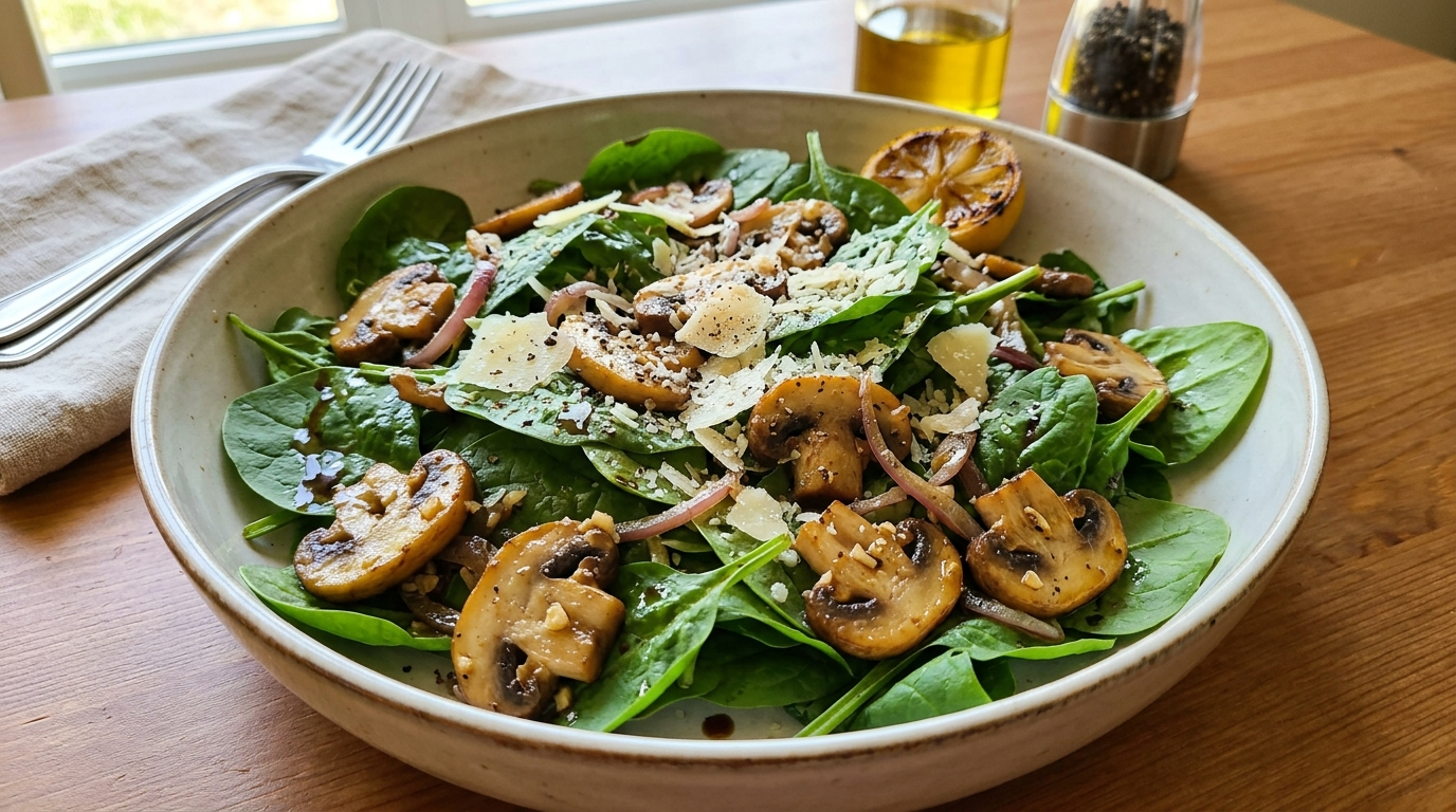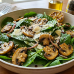 Ensalada de champiñones salteados con espinacas Ingredientes: (para 2 porciones) Champiñones: 200 g (aproximadamente 1 taza) Espinacas frescas: 150 g (aproximadamente 4 tazas) Aceite de oliva: 1 cucharada Ajo: 1 diente, picado finamente Cebolla morada: 1/4, en rodajas finas (opcional) Vinagre balsámico: 1 cucharadita Sal y pimienta: al gusto Jugo de limón: al gusto (opcional)…