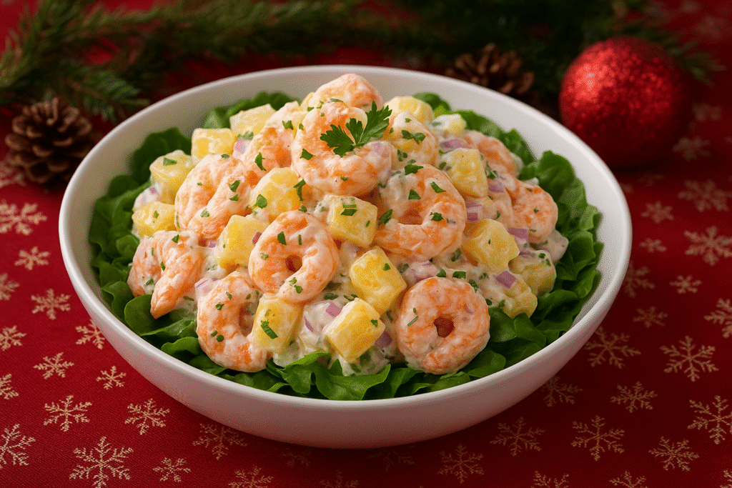 - En un tazón grande, mezcla los camarones cocidos con la piña, la cebolla y el apio.
