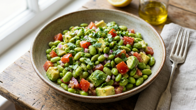 En un tazón grande, mezcla el edamame cocido, el aguacate, el tomate y la cebolla.