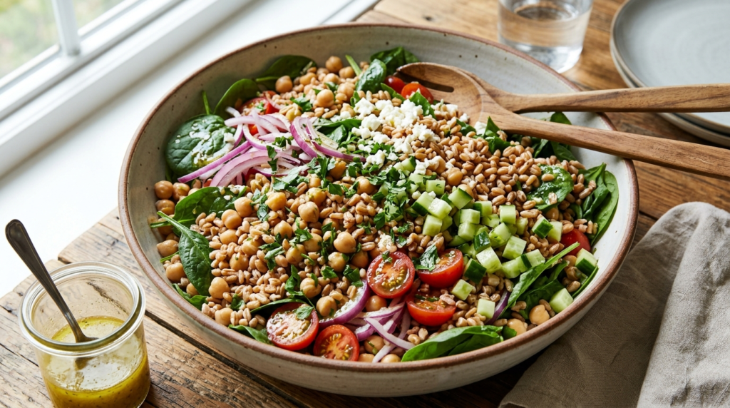 En un tazón grande, mezclar el farro cocido, los garbanzos, las espinacas, cebolla, tomates, pepino y perejil.