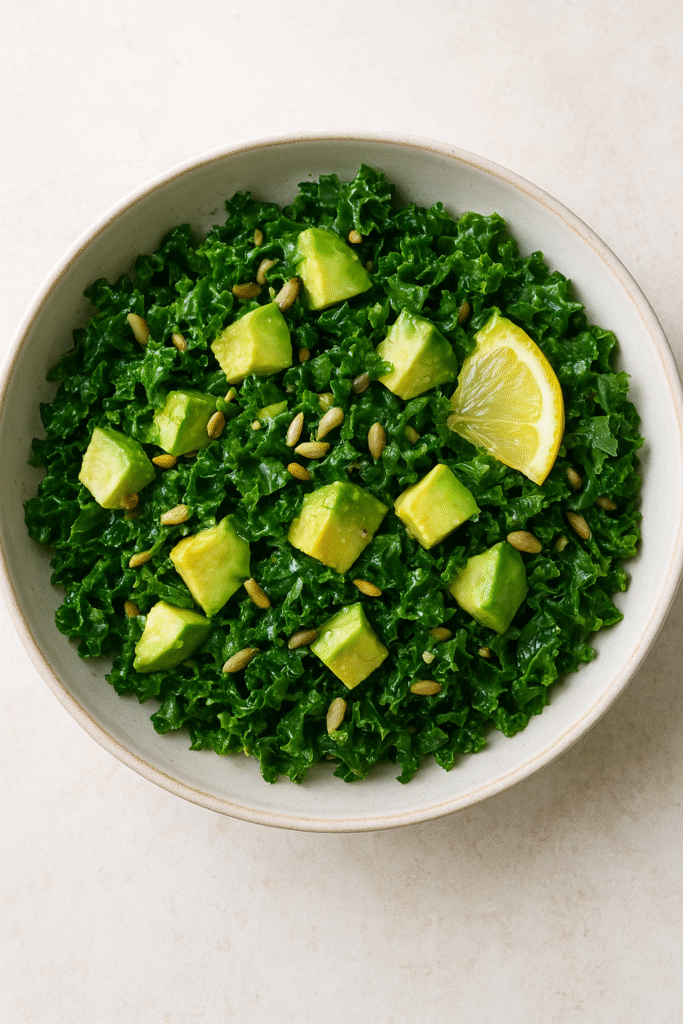 - Coloca el kale en un bol grande y agrega el jugo de limón, una pizca de sal y el aceite de oliva.