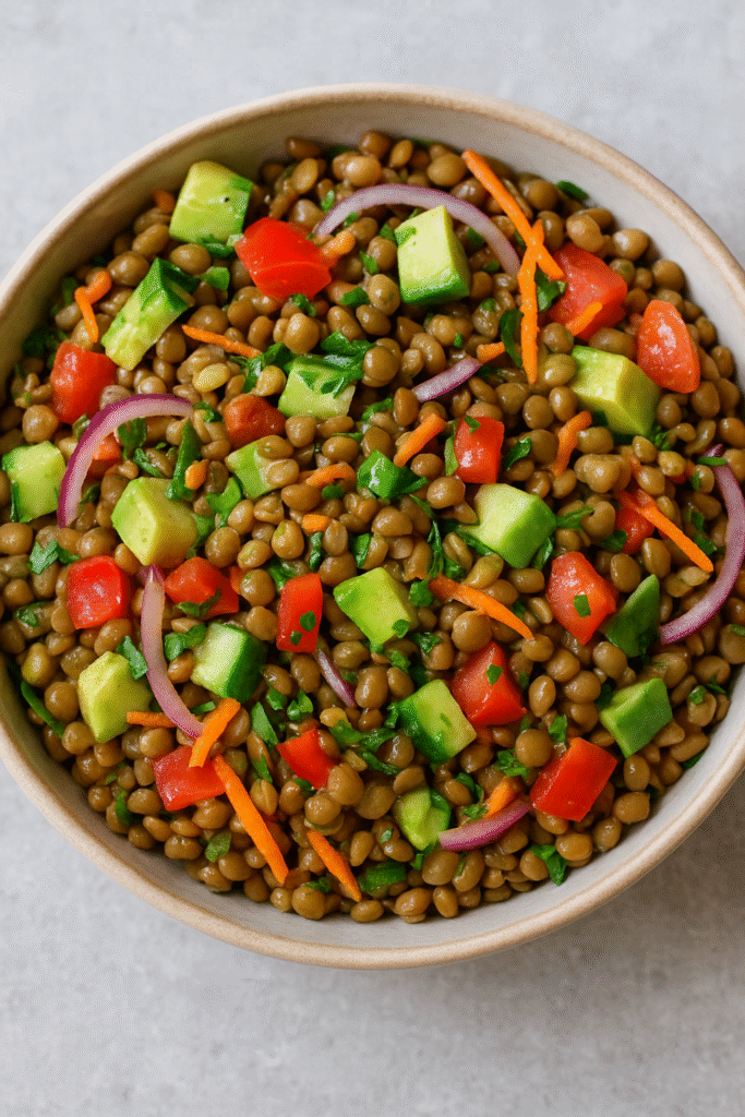 - En un bowl grande, coloca las lentejas cocidas y frías.