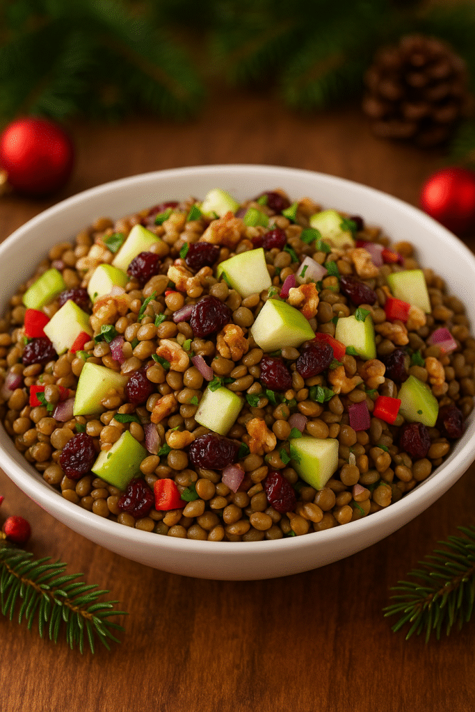 - En un bol grande, combina las lentejas frías, manzana, cebolla, pimiento, arándanos y nueces.