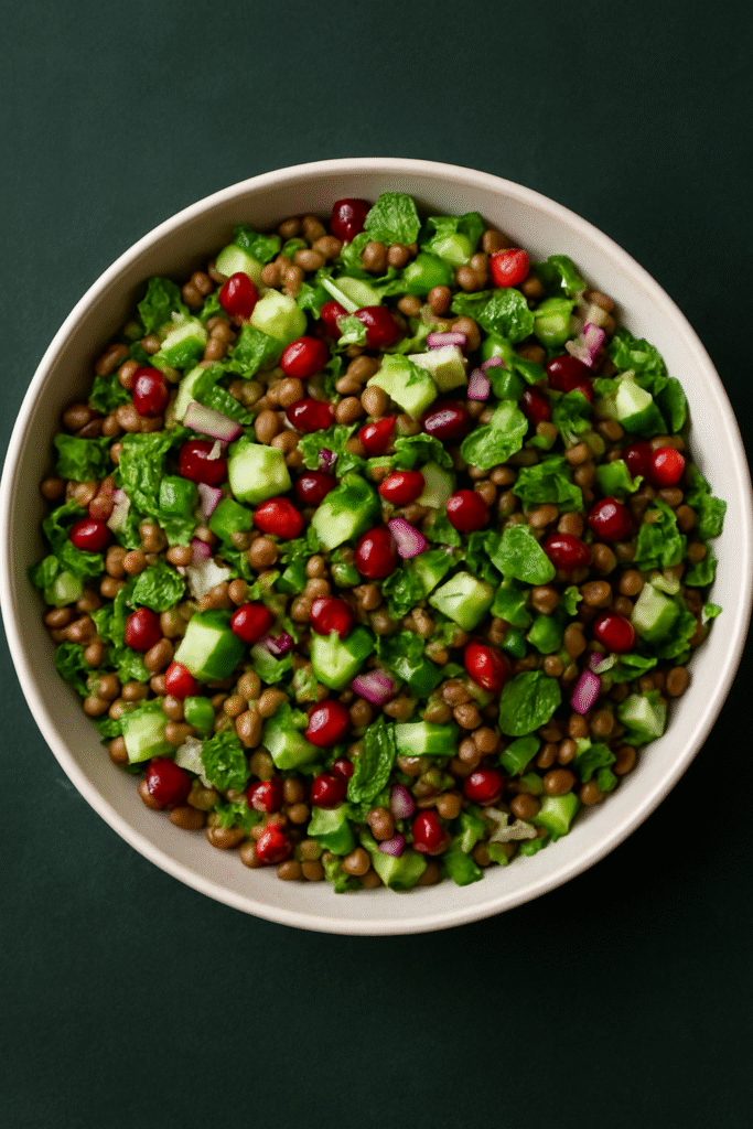 Ensalada de Lentejas Verdes con Pepino, Hierbabuena y Granada