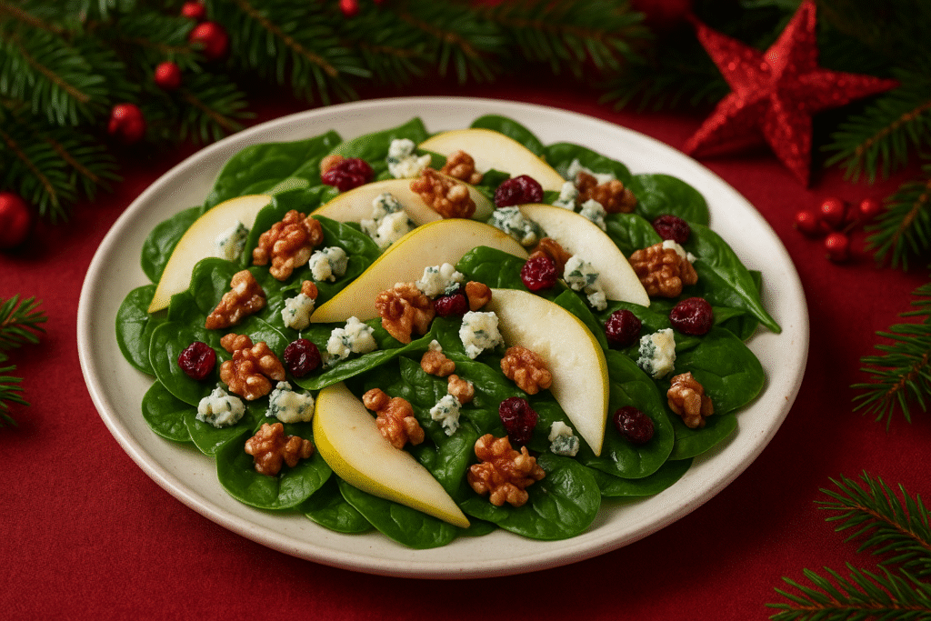 En una ensaladera coloca la espinaca fresca como base. Añade las rodajas de pera distribuyéndolas de manera uniforme. - Agregar ingredientes principales: