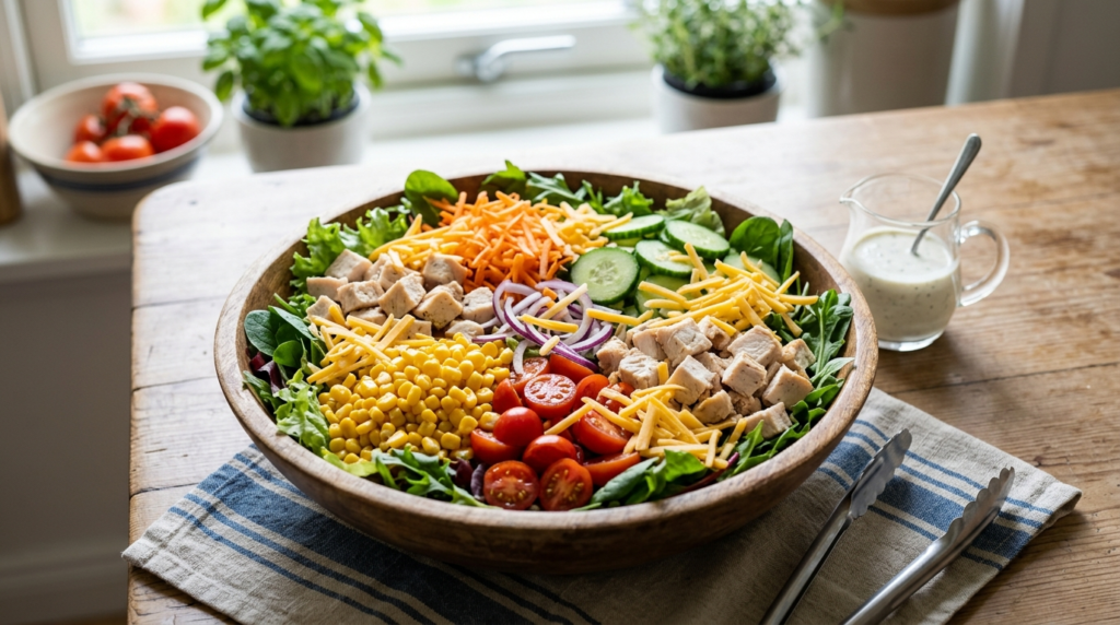 - Aderezo (puede ser ranch, mostaza y miel, o vinagreta) al gusto (aprox. 3-4 cucharadas por porción)