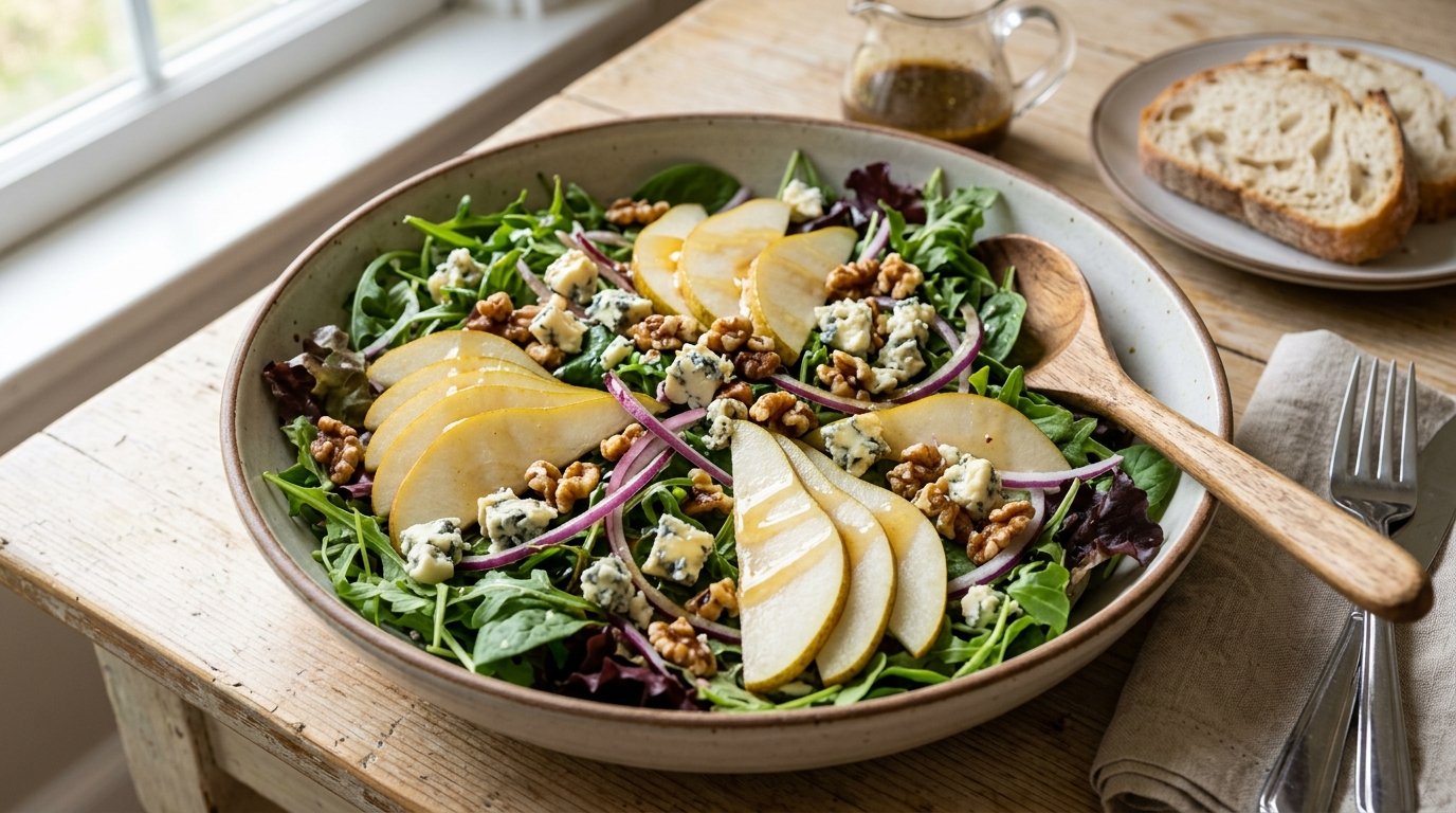 Ensalada de queso azul con peras y nueces Ingredientes: (para 4 porciones) 2 peras maduras (tipo conferencia o bosc), en láminas finas 150 g de queso azul, desmenuzado 100 g de nueces (puedes tostarlas ligeramente si gustas) 120 g de mezcla de hojas verdes (rúcula, espinaca baby, lechuga) 1/2 cebolla morada en rodajas muy finas…
