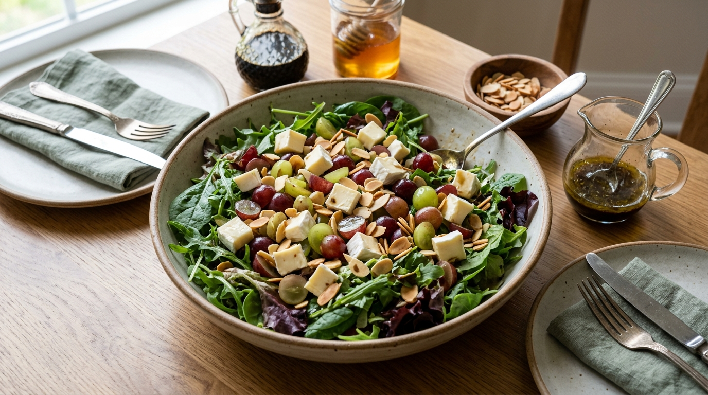 Ensalada de queso brie con uvas y almendras Ingredientes: (para 4 porciones) 150 g de queso brie (cortado en cubos pequeños) 1 taza de uvas moradas o verdes (cortadas por la mitad, sin semillas) 1/3 taza de almendras laminadas o enteras tostadas 100 g de mezcla de hojas verdes (rúcula, espinaca baby, lechuga, etc.) 2…