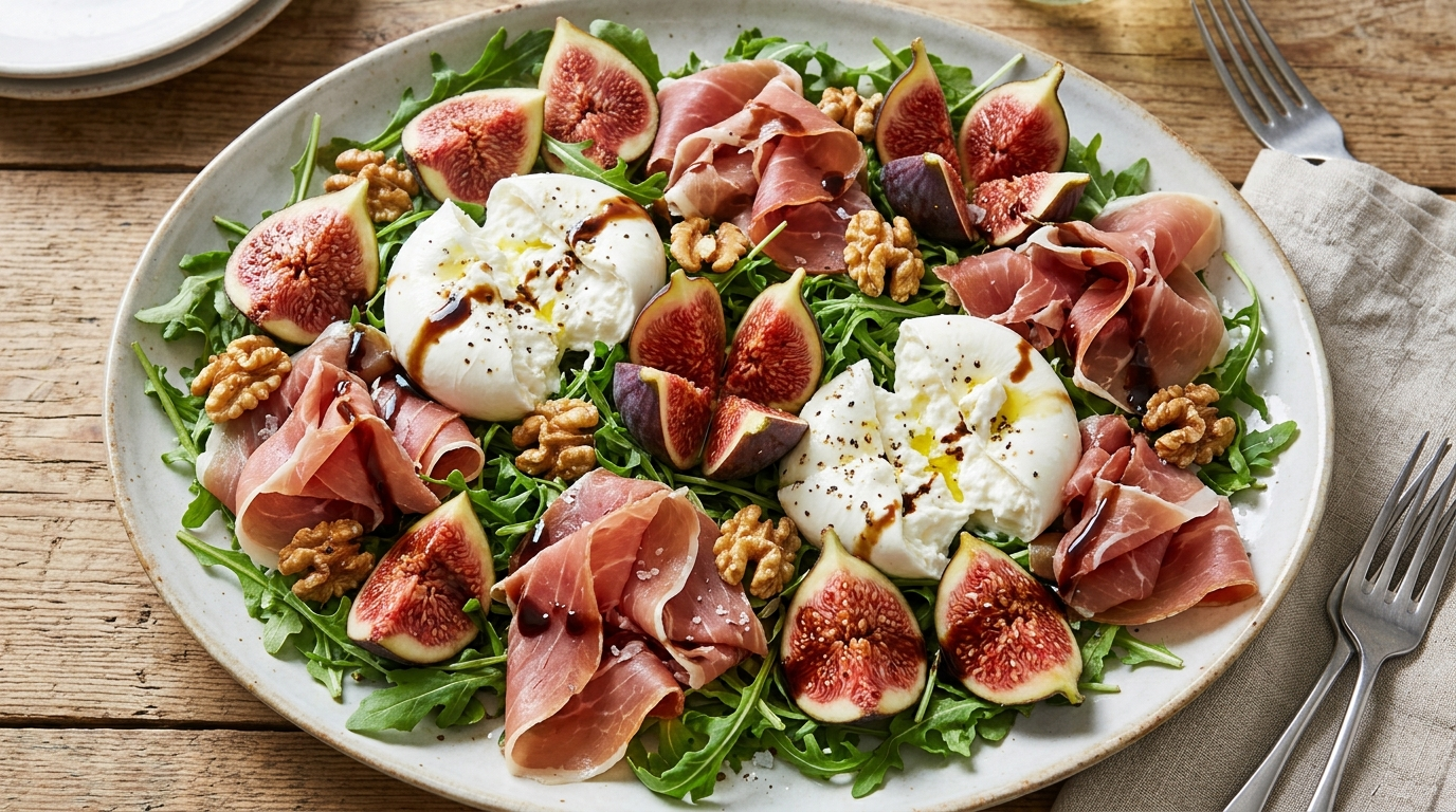Ensalada de burrata con higos y jamón Ingredientes: (para 4 porciones) 2 bolas de burrata (125 g cada una, aprox.) 8 higos frescos maduros 100 g de jamón serrano o jamón ibérico en lonchas finas 100 g de rúcula (o mezcla de hojas verdes) Un puñado de nueces o pistachos (opcional, para añadir textura) Reducción…