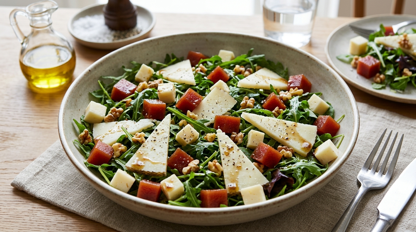 Ensalada de queso manchego con membrillo Ingredientes: (para 4 porciones) Queso manchego curado: 150 g Dulce de membrillo: 150 g Rúcula o mezcla de hojas verdes: 100 g Nueces (opcional): 40 g Aceite de oliva virgen extra: 3 cucharadas Vinagre balsámico: 1 cucharada Sal: al gusto Pimienta negra molida: al gusto Preparación: Lavar las hojas…