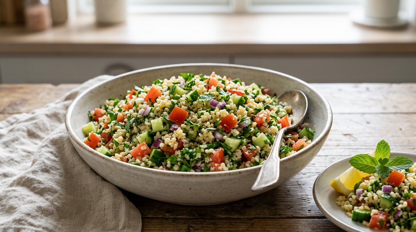 Ensalada árabe de tabulé Ingredientes: (para 4 porciones) 1 taza de bulgur (trigo partido) 1 ½ tazas de agua caliente 2 tomates medianos, picados en cubos pequeños 1 pepino, pelado y picado en cubos pequeños 1/4 de cebolla morada o blanca, finamente picada 1 manojo de perejil fresco, finamente picado 1/4 de manojo de menta…