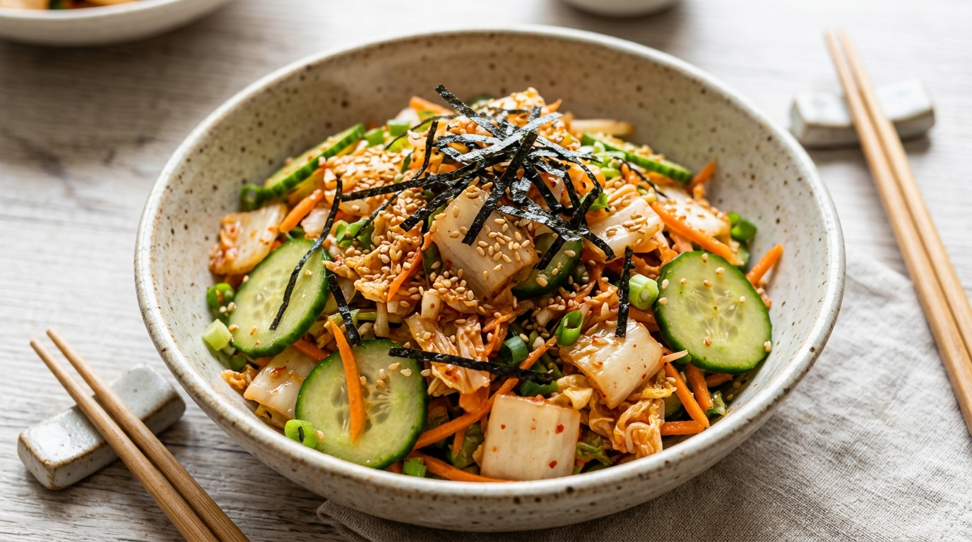 Ensalada coreana de kimchi Ingredientes: (para 2-3 porciones) Kimchi (300 g): Preferentemente bien fermentado. Pepino (1 mediano): Cortado en rodajas finas. Zanahoria (1 mediana): Rallada o cortada en tiras finas. Cebollín (3-4 ramas): Picado finamente. Ajo (2 dientes): Picado o rallado. Sésamo tostado (1 cucharada): Para decorar. Vinagre de arroz (1-2 cucharadas): Ajustar al gusto.…