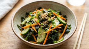 Ensalada japonesa de algas wakame Ingredientes: (para 4 porciones) Algas wakame deshidratadas: 25-30 gramos (aproximadamente 1 taza de algas hidratadas) Pepino: 1 pepino pequeño, cortado en rodajas finas Zanahoria: 1 zanahoria, pelada y cortada en juliana o tiras finas Vinagre de arroz: 2 cucharadas Salsa de soja: 2 cucharadas Aceite de sésamo: 1 cucharada Azúcar:…