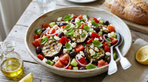 Ensalada mediterránea de berenjena Ingredientes: (para 6 porciones) 1 berenjena grande (aproximadamente 400-500 g) 1 pimiento rojo (puedes usar también pimiento amarillo o verde) 1 tomate grande (o 2 tomates medianos) 1 pepino (opcional, si te gusta añadir frescura) 1 cebolla morada pequeña 50 g de aceitunas negras (o verdes, según preferencia) 30 g de…