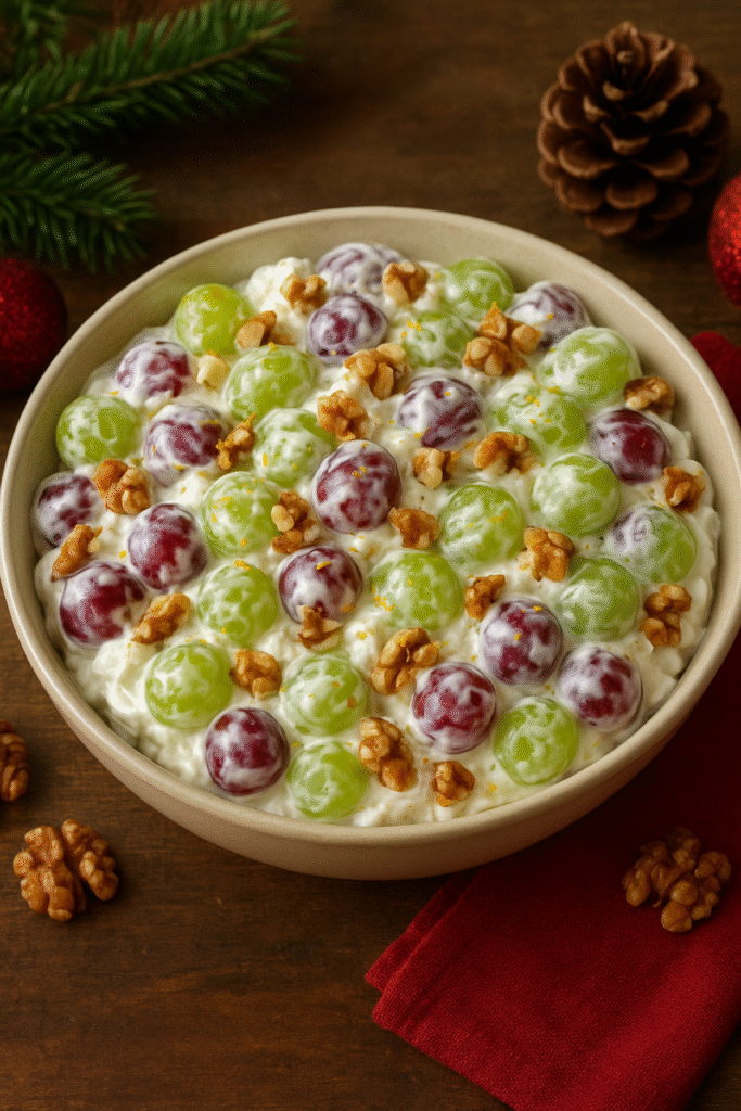 - Agrega las uvas al bowl y mezcla suavemente hasta que queden bien cubiertas con la crema.
