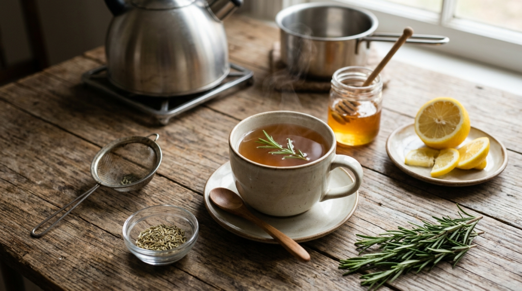 Infusión de Romero con Limón Ingredientes (para 1 taza): 1 cucharadita de hojas secas de romero (o 2 ramas pequeñas de romero fresco) 1 rodaja de limón o unas gotas de jugo de limón fresco 1 taza de agua (aprox. 250 ml) Opcional: miel al gusto Preparación: Hervir el agua: Pon a calentar la taza…