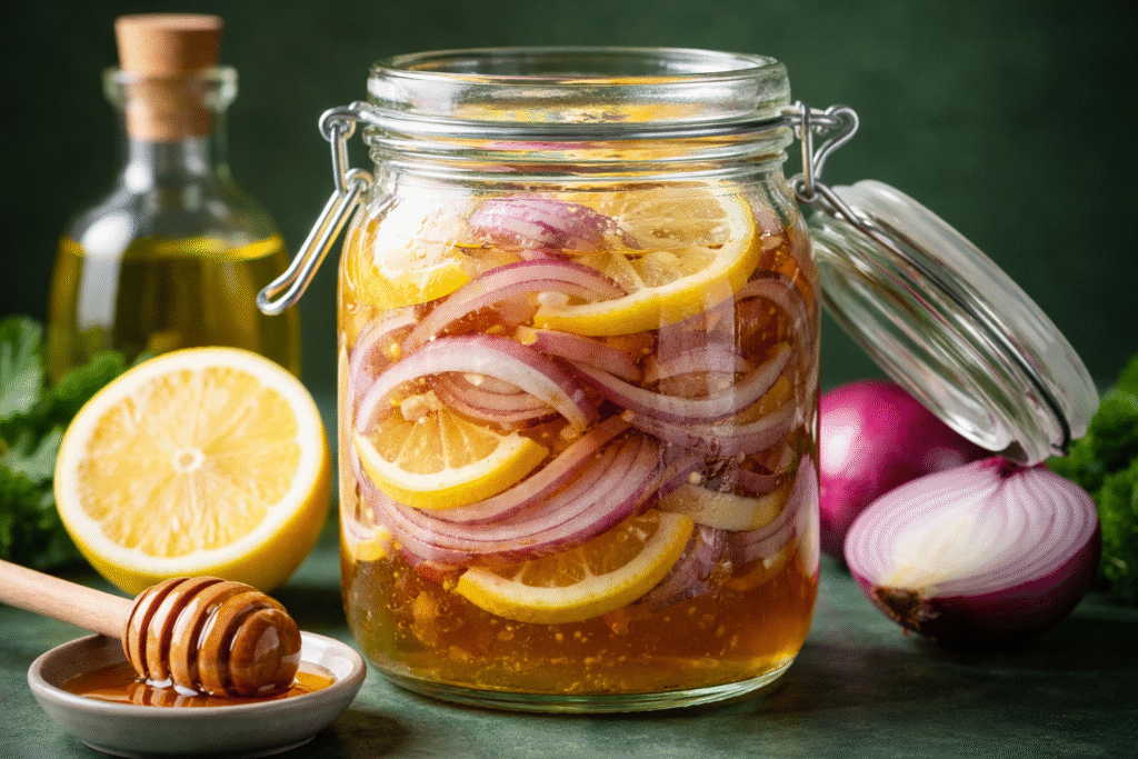 Jarabe de cebolla, limón, miel y aceite de oliva