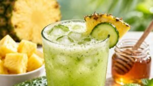 Jugo natural de piña, pepino y limón Ingredientes 2 rodajas de piña fresca ½ pepino Jugo de 1 limón 1 vaso de agua Miel (opcional, al gusto) Hielo (opcional) Preparación Pela y corta la piña en trozos pequeños. Lava bien el pepino y córtalo en rodajas. Coloca la piña, el pepino y el agua en…